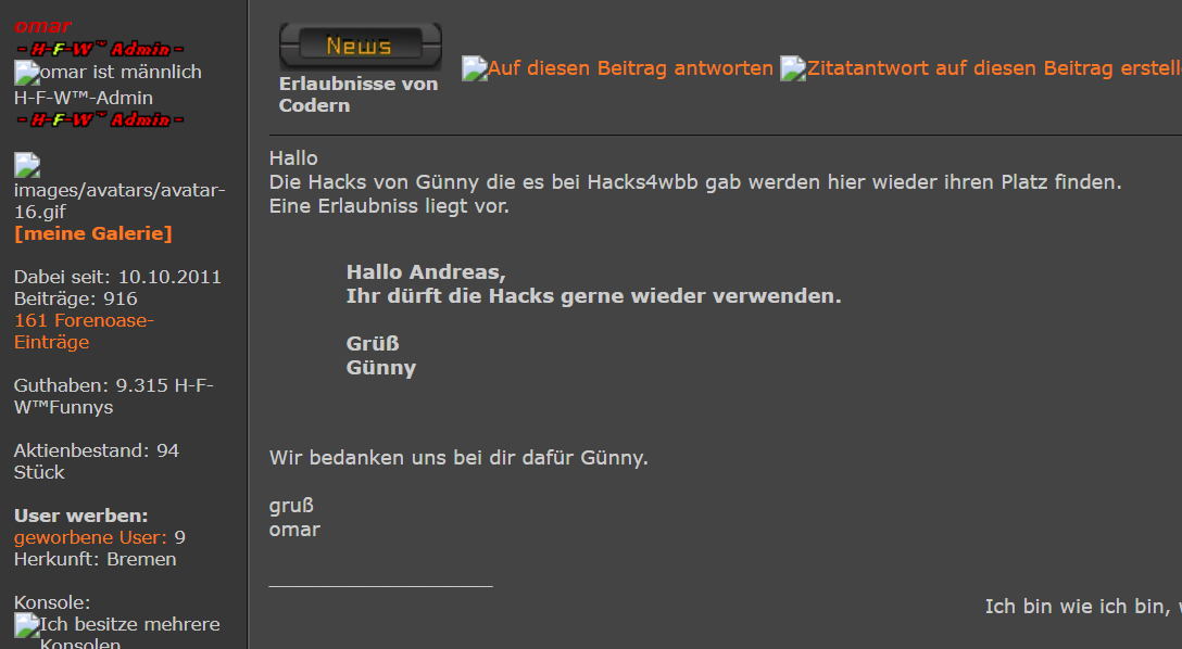 | Hacks4wbb by HFW™ » Rund um Hacks 4 WBB » Copyright & Erlaubnisse » Erlaubnisse von Codern & Eigentum von HFW™ » Günny |