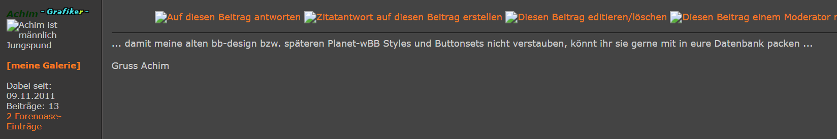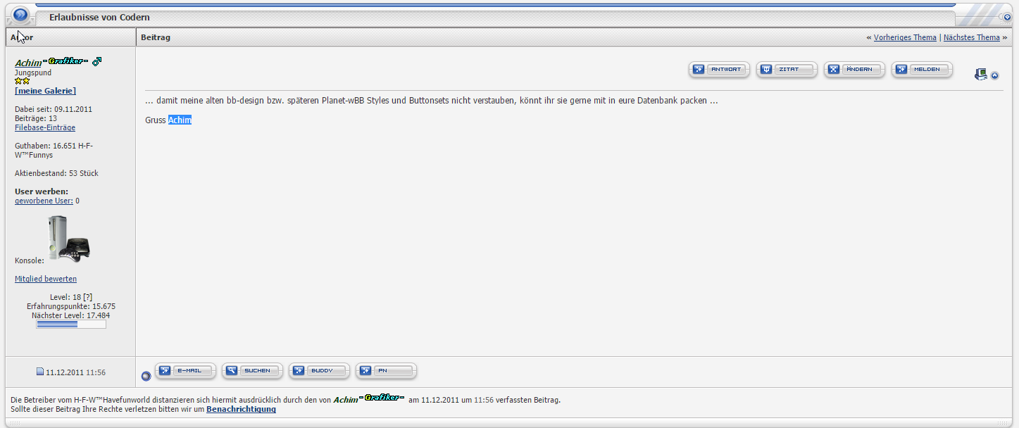 | Hacks4wbb by HFW™ » Rund um Hacks 4 WBB » Copyright & Erlaubnisse » Erlaubnisse von Codern & Eigentum von HFW™ » Achim Planet wbb |